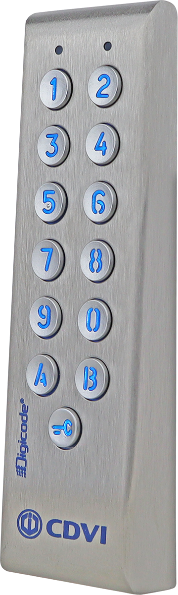 Kapeaprofiilinen pinta-asennettava koodilukko on valmistettu ruostumattomasta teräksestä, ja se on suunniteltu kahden oven ohjaamiseen.