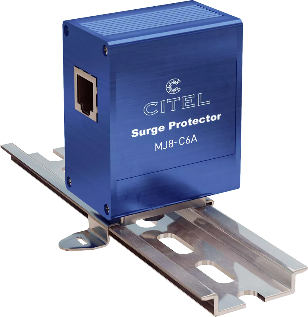 DIN-kiskoon asennettava PoE-ylijännitesuoja, joka on suunniteltu suojaamaan PoE-kaapelointiin kytkettyjä laitteita hetkellisiltä ylijännitteiltä.