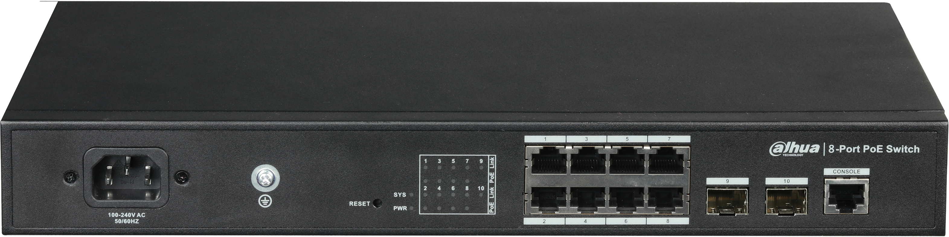 Dahua hallittava, tuulettimeton 8-porttinen kytkin. Kaikki liittimet etupaneelissa.