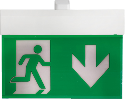 Kompakti poistumisvalo, 30 m, jatkuva valaisu, väyläohjattu. IP40. Yhden tunnin akkuaika.