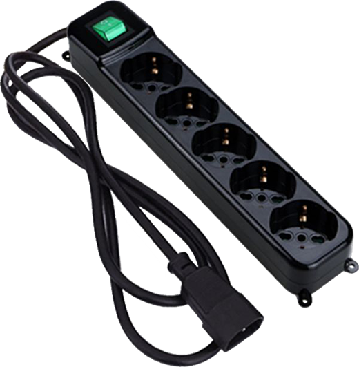 IEC C14 -liitännällä varustettu 5-paikkainen kuormakaapeli, joka mahdollistaa tavallisten suko-pistokkeiden kytkemisen UPS-varavirtalähteisiin, joissa on IEC-pistokkeet.