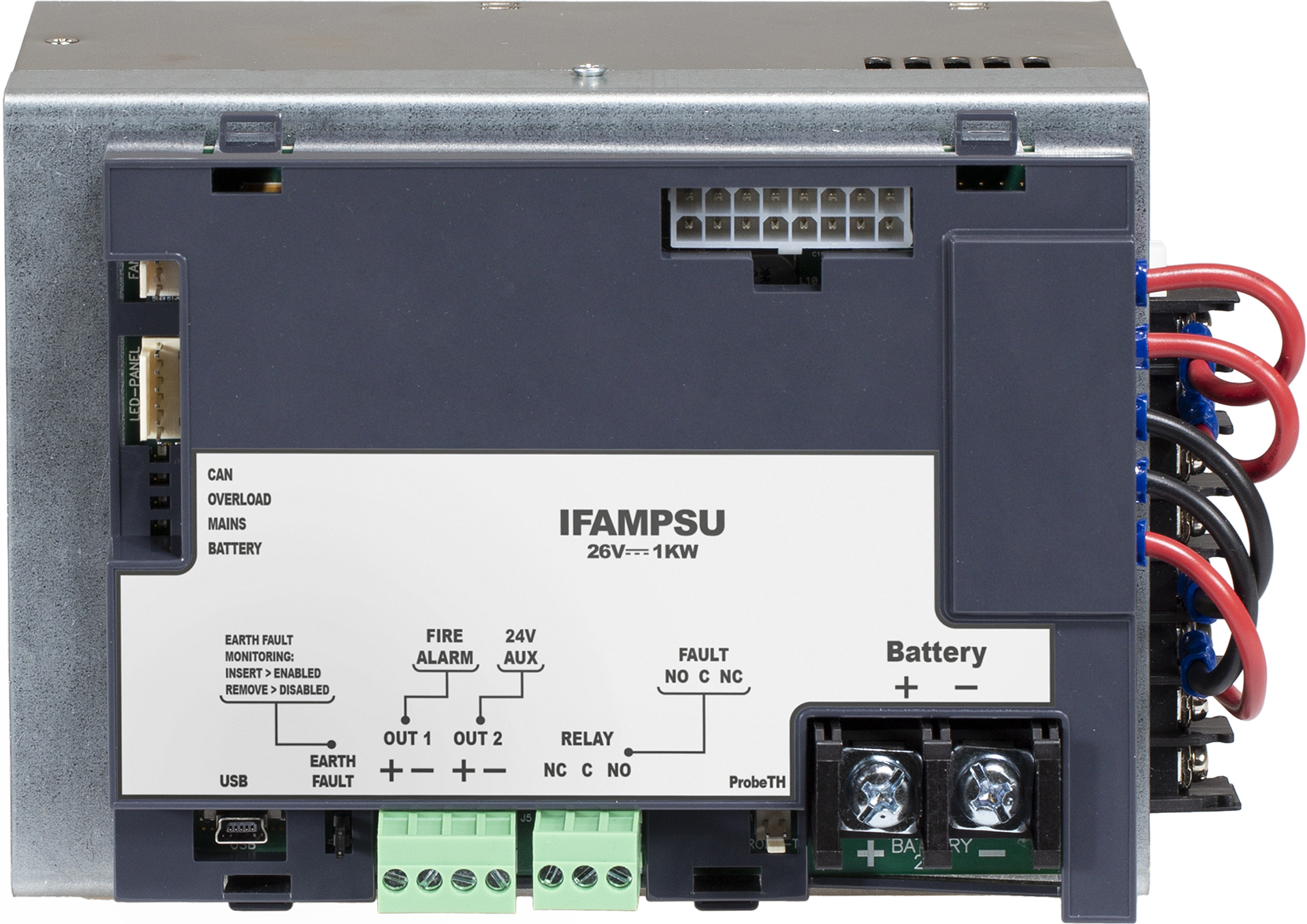 IFAMPSU-virtalähdemoduuli kytketään verkkovirtaan, ja se syöttää järjestelmään enintään 40 A virran. Moduulissa on 3 A akkulaturi, joka pystyy pitämään latauksessa kaksi 17, 24 tai 40 Ah akkua.