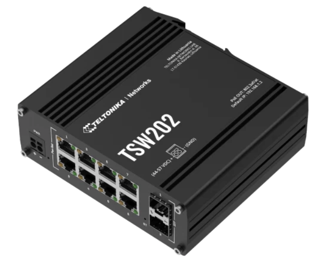 Teltonika TSW202 on hallittava PoE-kytkin joka on varustettu kahdella SFP-portilla ja kahdeksalla gigabitin Ethernet-portilla, jotka tukevat PoE-standardeja 802.3af ja 802.3at.
