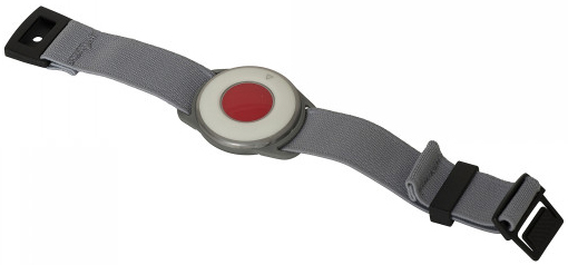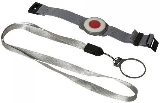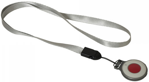 Sisältää kaulanauhan ja rannehihnan. Pariston odotettu käyttöikä on 5 vuotta normaalissa käytössä.