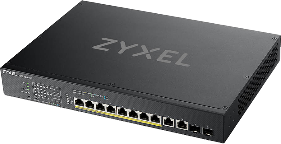 Zyxel XS1930-12HP on älykkäästi hallittava, monipuolinen 8-porttinen Multi GbE PoE-kytkin, jossa on lisäksi kaksi Multi GbE -porttia ja kaksi 10 GbE SFP+ uplink -porttia.